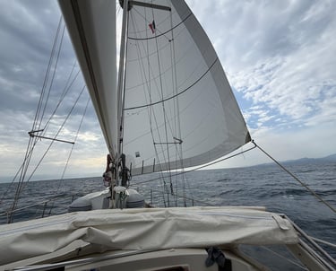 The next morning, after exchanging contact details (we never say goodbye), we set offâstraight into wind and waves that definitely hadnât been in the forecast. Novera didnât mind. She showed off her surfing skills in swell over a metre and waves up to 1.5m. With the sails reefed and the wind finally returning after days of motoring, we flew alongâhair wild, feet braced, adrenaline high, grinning like kids.