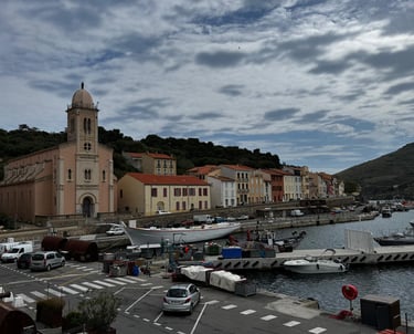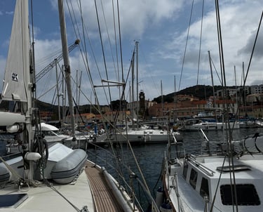 Our next stop was PortâVendresâa lovely marina with a slightly nerveâjangling entrance. Tight spaces, ropes everywhere, not much room for error. With earpieces in and our calm voices on, we talked each other through it and slid into our berth like seasoned pros⊠mostly. I did drop a rather slimy rope, which dented our cool factor a little đ€Ł. Thankfully, the Capitainerie team were patient and helpful, which made all the difference.